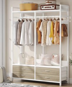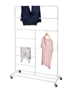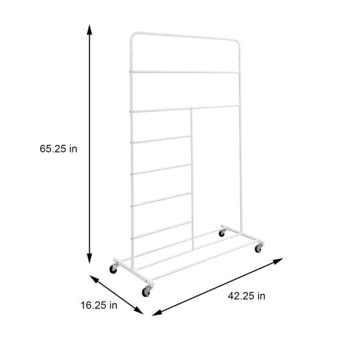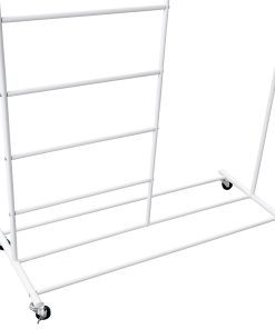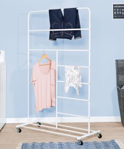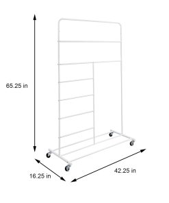 This White Rolling Multi Use Laundry Clothes Drying Rack provides significant drying space for all your laundry day needs. The wheels allow you to easily move it around from room to room as needed and the t-bar adds even more drying space for putting shirts, dresses or tank tops on hangers. Durable and highly functional, this will make laundry day a breeze.